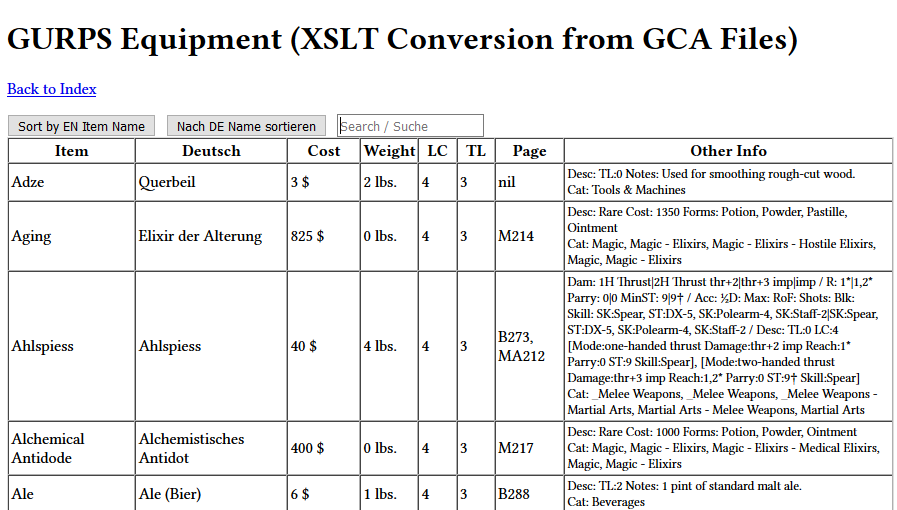 I had an idea I'd like to share with you, namely, to display the existing GCA data files' equipment sections as a sortable, filterable shopping list (like in this screenshot). Since this uses existing data (.GDF data sheets) and mechanisms (a .GCE export sheet), I'm confident that it wouldn't violate SJGames online policy... possibly as long as one has a valid GCA4 license to get at the "official" GDF files and actually use a GCE export sheet on them. What you need: