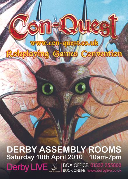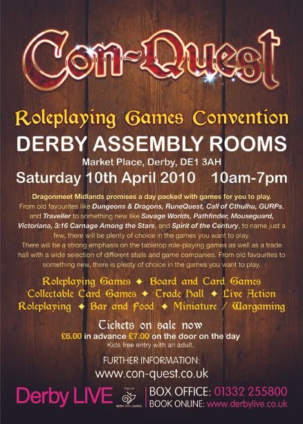 http://i122.photobucket.com/albums/o...-backsmall.jpg Con-Quest Lives ! Con-Quest is a new gaming convention taking place at the Derby Assembly Rooms on Saturday 10th April 2010. Formerly known as ‘Dragonmeet Midlands’, Con-Quest is a one day show packed with all manner of gaming activities and trade stands. Whether it’s role playing games, board and card games or miniature wargames, Con-Quest has them all, as well as trade stands offering everything from the very latest releases to collectables and hard to find items. Whatever your gaming needs Con-Quest aims to deliver! The event will be taking over the majority of the Derby Assembly Rooms, offering numerous areas for demonstration and participation games, artist displays, game manufacturers and designers, trade stands and areas to simply meet up with friends and catch-up on one of the bars or cafes on site. The event is family friendly and welcomes both veteran gamers as well as those just wanting to find out more about the gaming hobby. Tickets are on sale now from the Assembly Room box office - http://www.derbylive.co.uk and keep checking back to the Con-Quest web site at www.con-quest.co.uk for the latest updates. For trade enquiries please contact darransims@gmail.com Long live Con-Quest! Tickets are on sale from the Derby LIVE Assembly Rooms Box Office. http://www.derbylive.co.uk Telephone: 01332 255800 Advance price £6.00 [£7.00 on the door on the day].